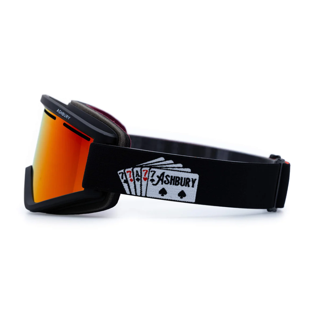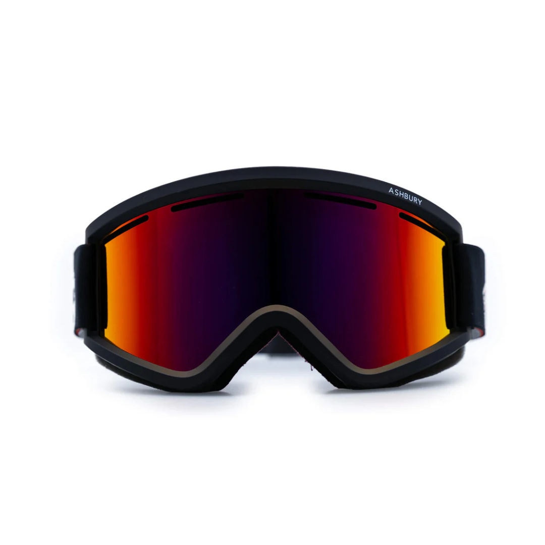 LENS: Full Revo Black Red Mirror & Yellow Low LightFRAME: Matte Black With Classic Snap ClosureSTRAP: Woven Black, Red & White