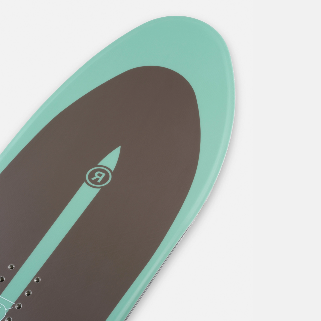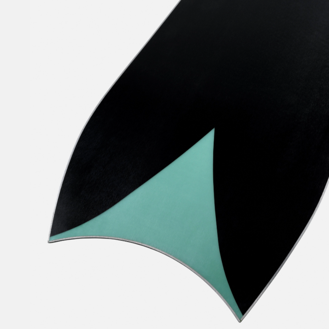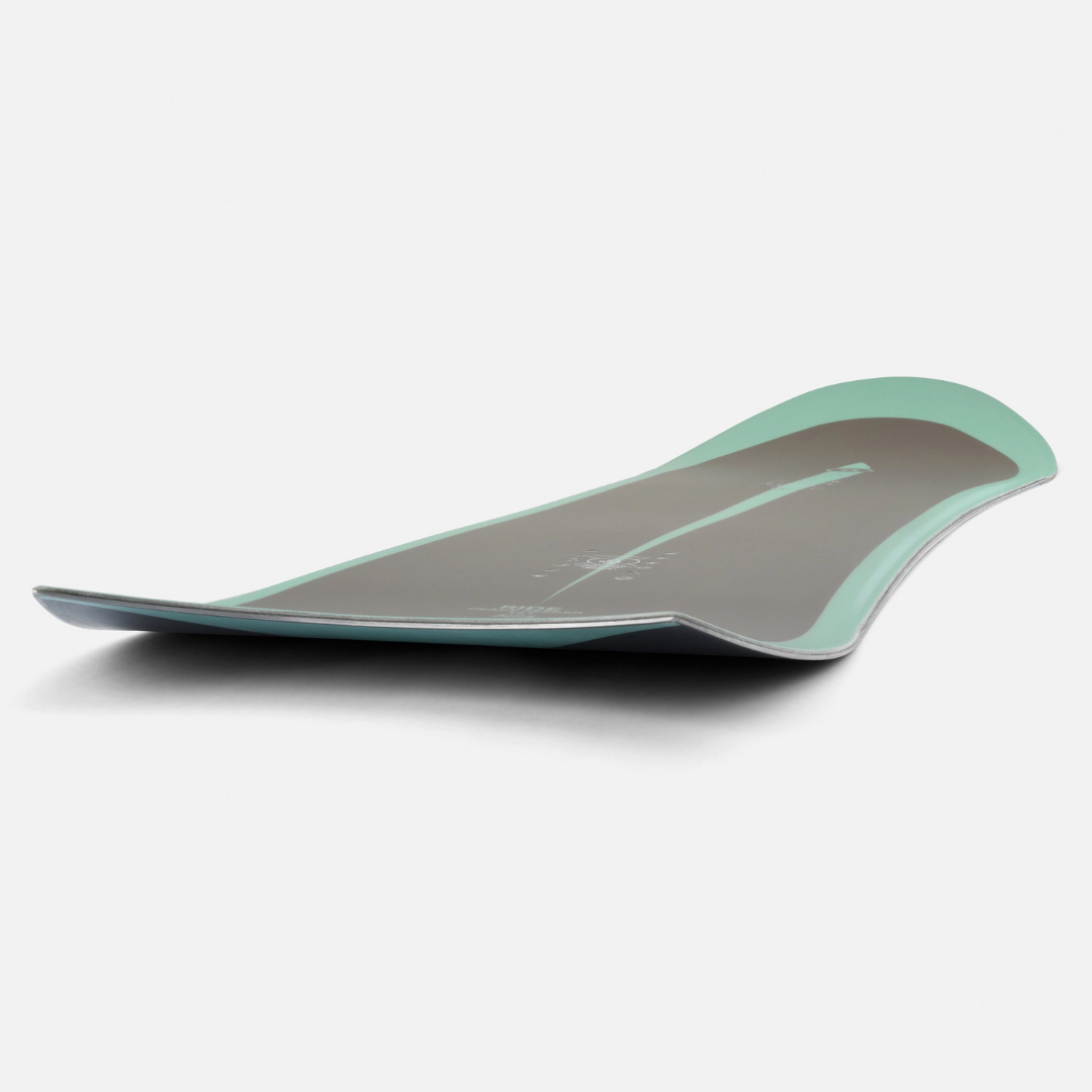 A twin sidecut which allows for the underfoot width of a wide board in the tip/tail width of a standard size. This design provides improved leverage on landings, grip through turns, and stability on flat base.